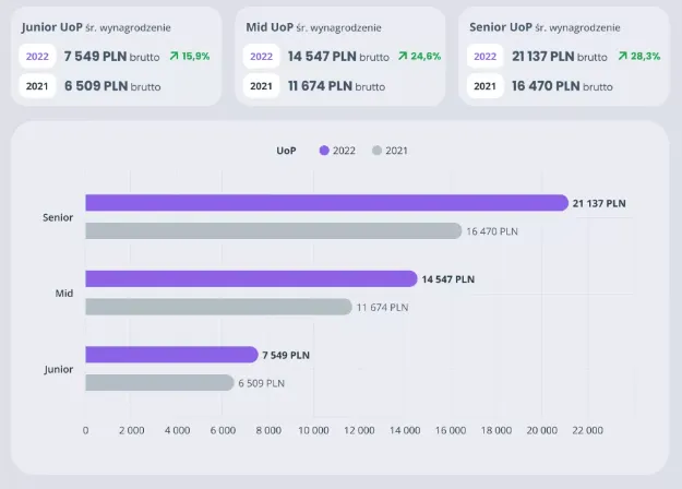 Kluczowe informacje:- Średnia pensja programisty stron internetowych wynosi około 15 000 zł brutto dla umów o pracę.